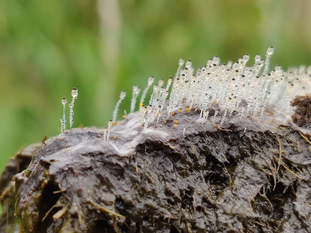 Pilobolus or "Dung Canon" is a normal fungi found in dung pats that grows to 2-4cm tall. The lungworm larvae crawl up the fungus to the head which then explode spreading the larvae 2 metres from the pat. It is these larvae which contaminate pasture and infect other cattle.