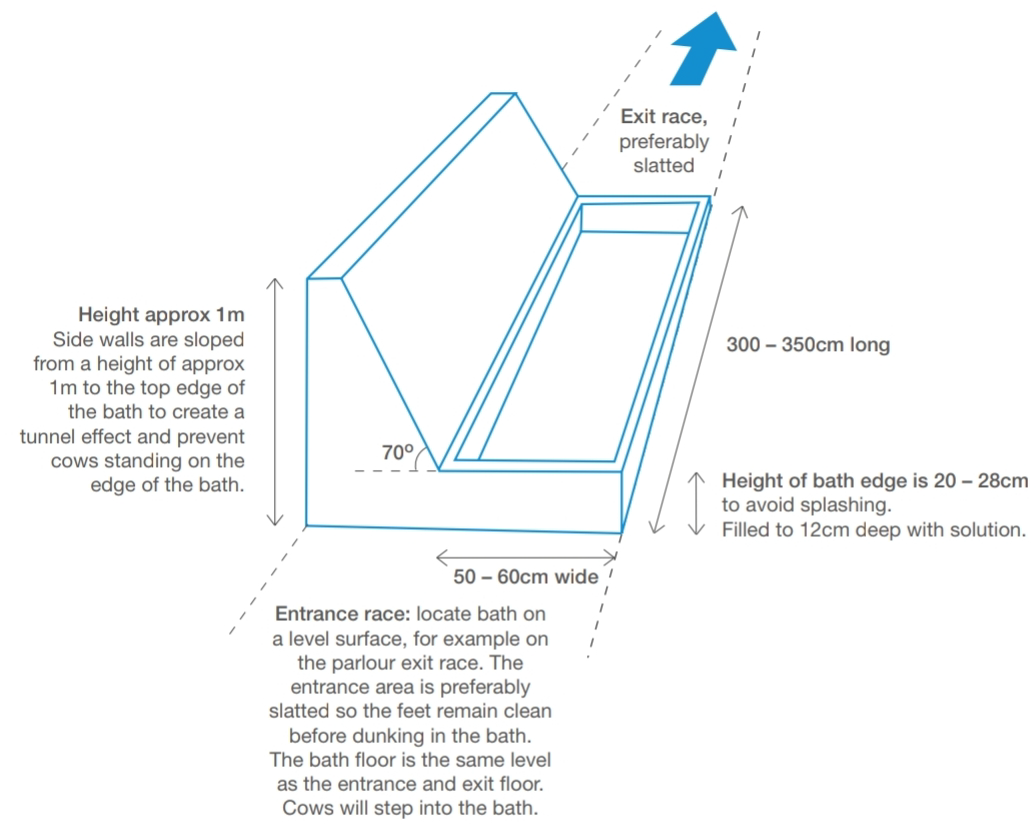 - Cows don't like to step up or down into the footbath so the bottom of the bath should be at the same level as the entry/exit points