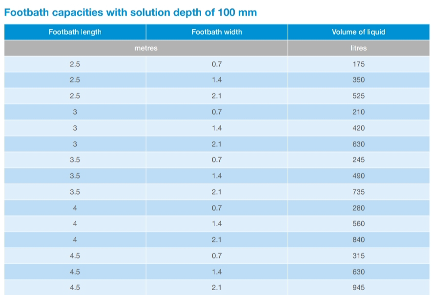 As a rule of thumb: you'll need 1 litre of solution for every cow to pass through - so a 200 litre footbath needs to be changed every 200 cows