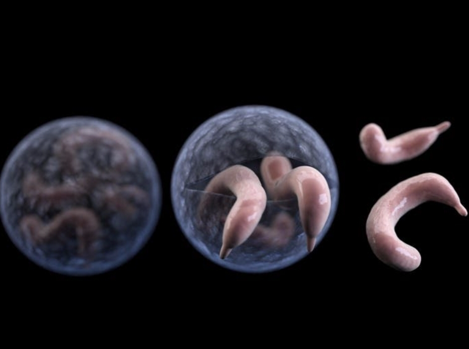 Two types of oocyst are released from the gut cells - a thick walled one that is shed in the scour and can survive for 12 months in the environment, and a thin walled one which immediately bursts and releases the four infective sporozoites whilst still within the calves gut causing immediate re-infection and worsening symptoms.